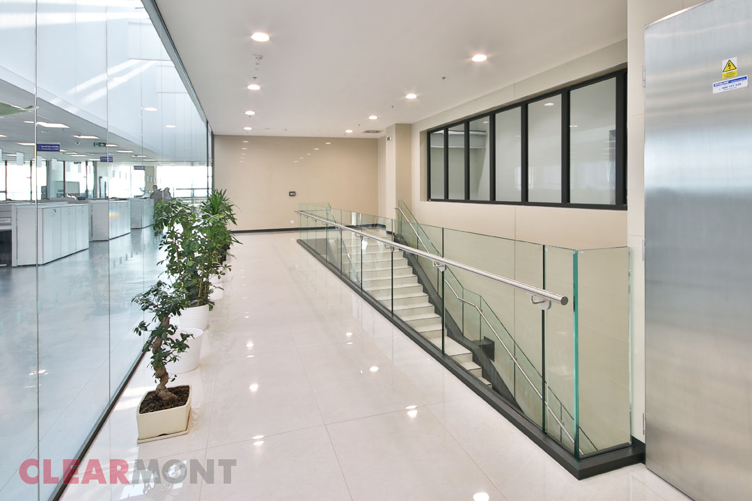 V administrativní části objektu jsme dodali a instalovali přibližně 400 m² celoskleněných příček CLEARside a celoskleněných dveří CLEARshine plus 40 m skleněného schodišťového zábradlí CLEARsave. Pro obvodové rámy příček z kaleného skla byly zvoleny exkluzivní profily Deubl Alpha. Dveřní kování Dorma Glas Universal doplňují podlahové zavírače dormakaba BTS 75 a paniková madla Assa Abloy na únikových dveřích. Za zmínku stojí 4 m vysoká skla v zasedací místnosti vstupní haly, stejně jako technologie lepení skleněných panelů bez svislých profilů. Mezi speciality patří také skleněné dělicí žebro, které zpevňuje konstrukci v bloku kanceláří TOP managementu. Nejdelší příčka napříč celým horním podlažím odděluje Open Space kanceláře od schodiště, zasedacích a servisních místností. Vstupní halu jsme spojili s galerií v horním podlaží schodištěm osazeným skleněným zábradlím - včetně nerezových systémových madel a lakovaných obkladů. Součástí naší dodávky v obou podlažích bylo také 5 celoskleněných dveří mezi chodbami a sociálními místnostmi (toalety, sprchy, úklidové prostory).