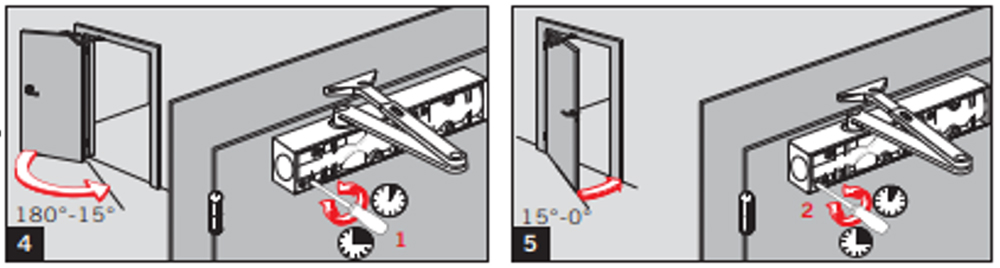 - Rychlost zavírání se nastavuje regulačním ventilem (obvykle označeným číslem 2) v rozmezí přibližně 180° - 15°. Tento ventil reguluje průtok hydraulické kapaliny a tím určuje, jak plynule se dveře zavírají