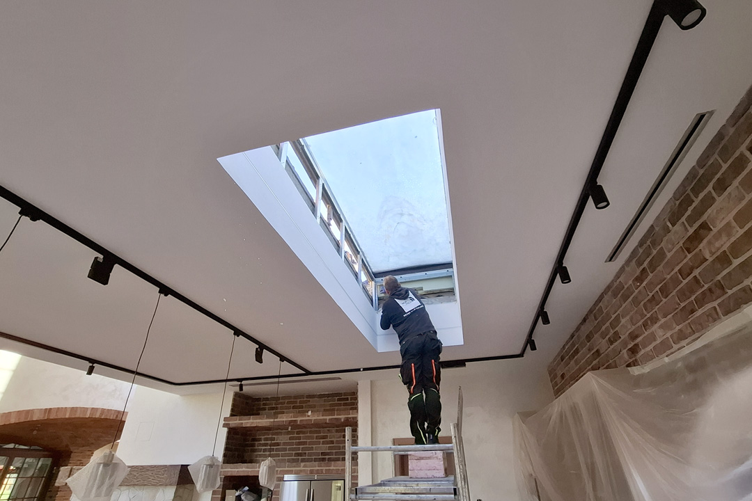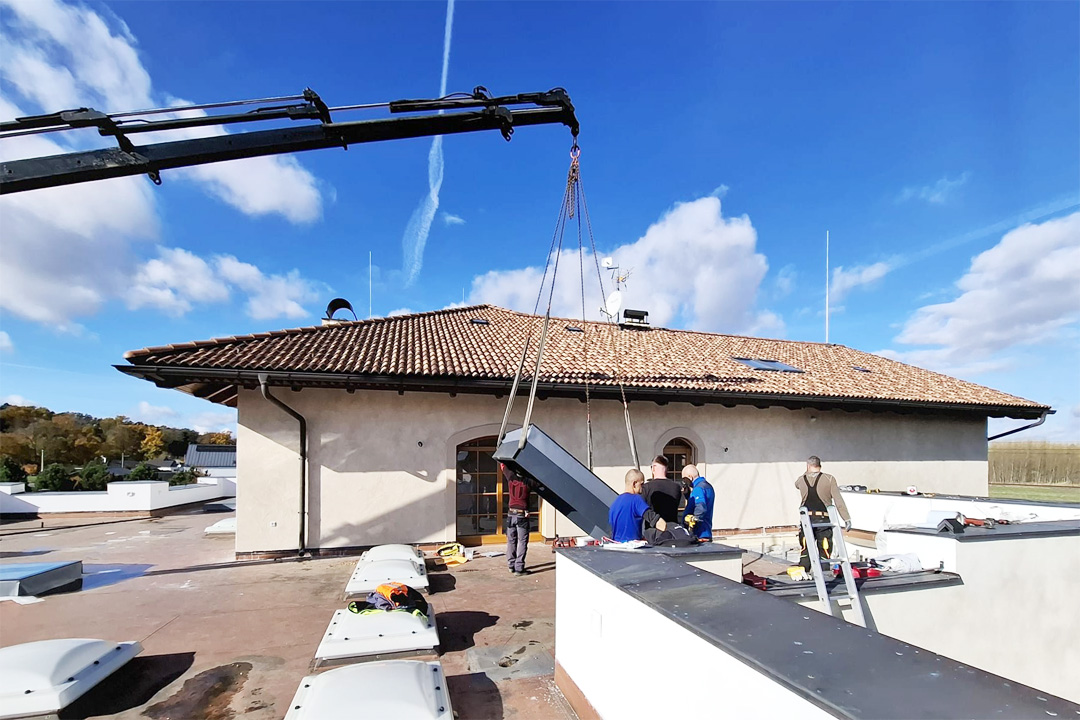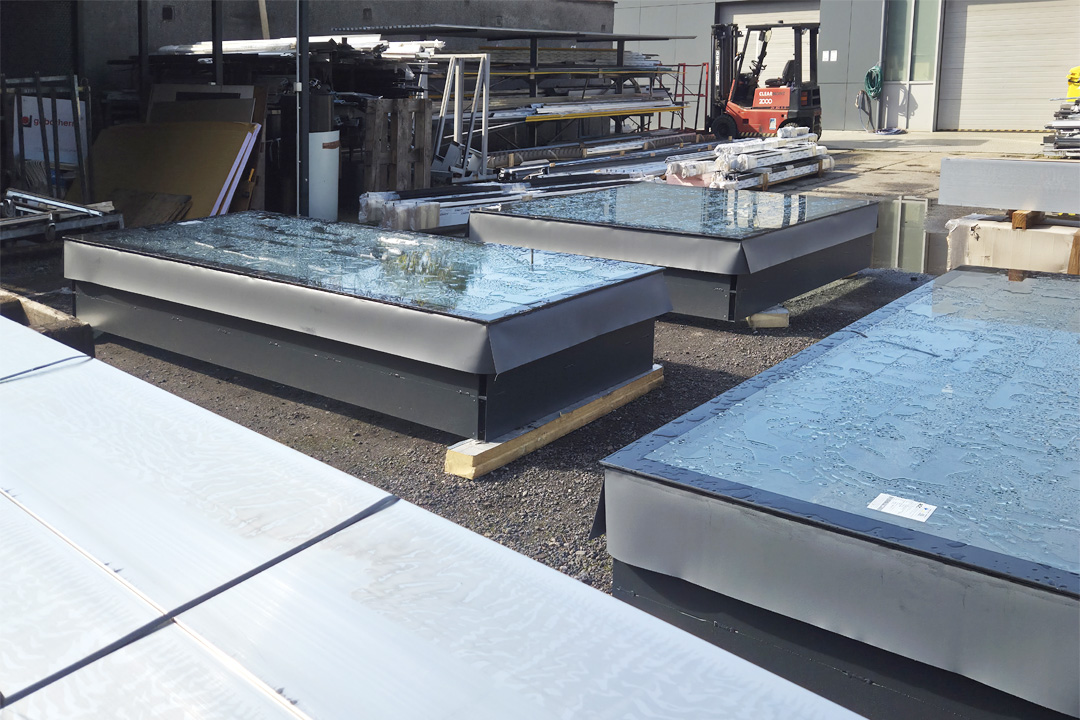 Světlíky jsou nainstalovány na ploché střeše v horizontální poloze, tedy s nulovým sklonem. Důmyslné konstrukční řešení eliminuje riziko zatékání. V tomto případě se jednalo o velkoformátové světlíky s největším rozměrem 3.700 × 1.300 mm.